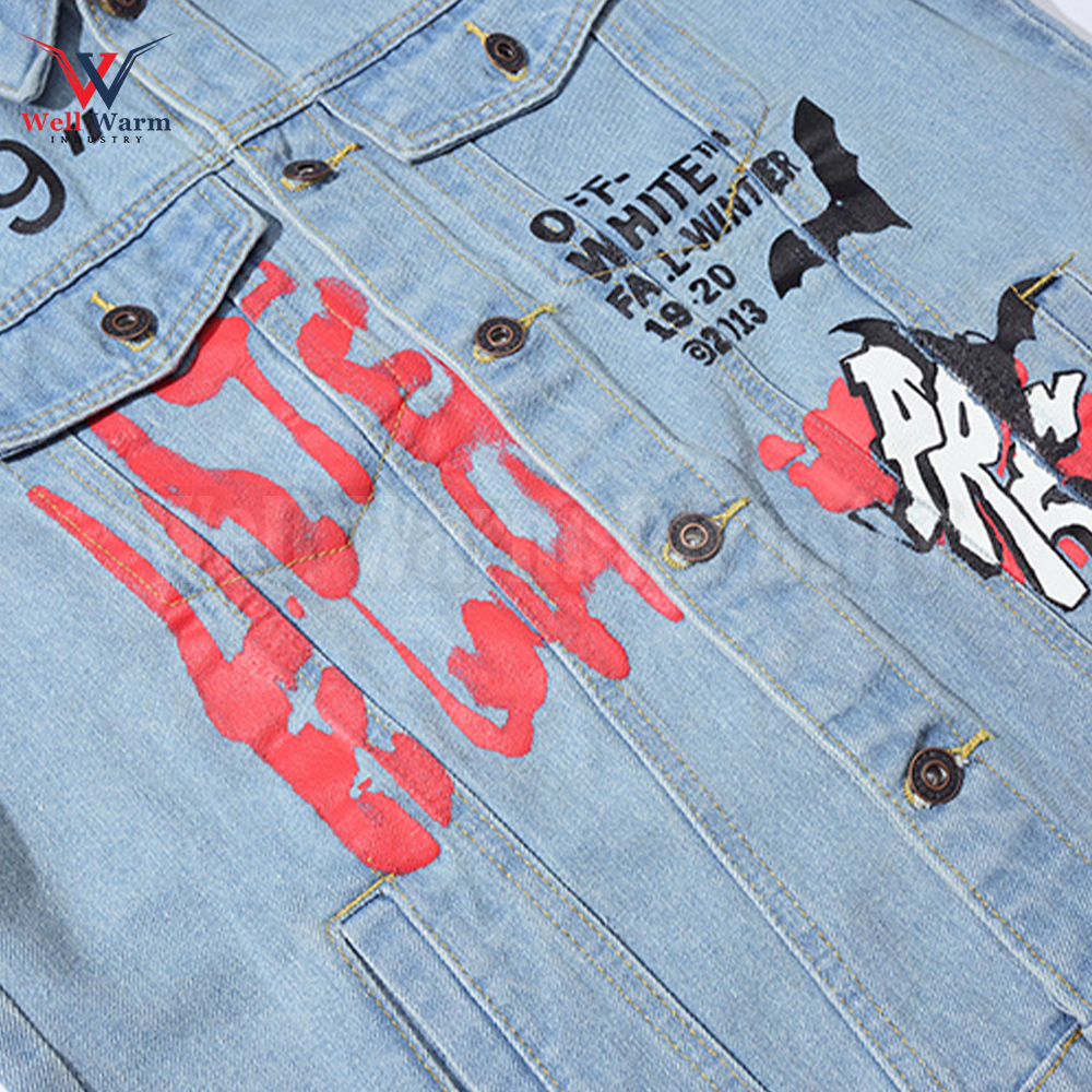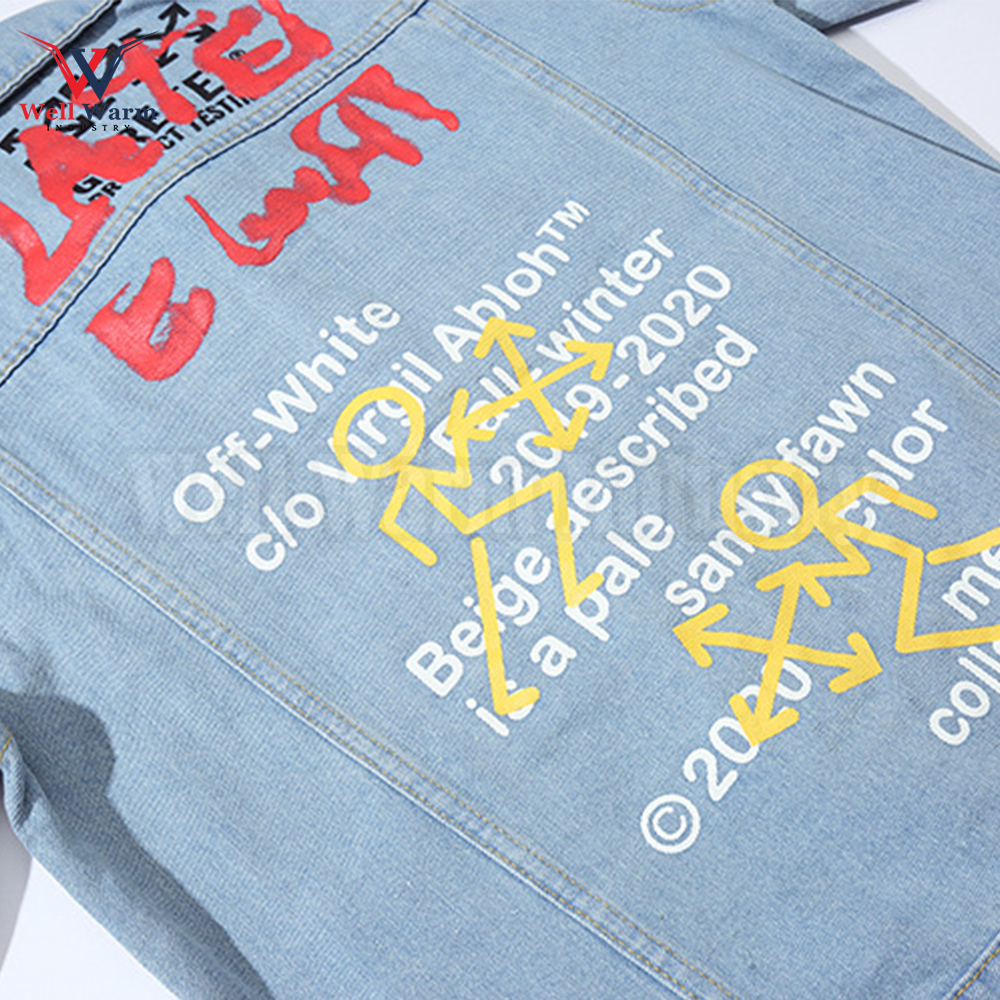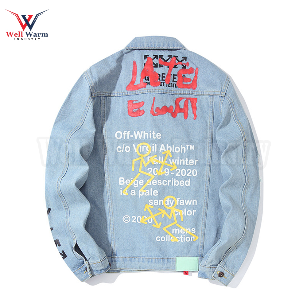 Be the first to review “American Trendy Denim Jacket Graffiti Alphabet Arrow Printed Boys Cotton Denim Jeans Ripped Sleeve Custom Denim Jacket”
